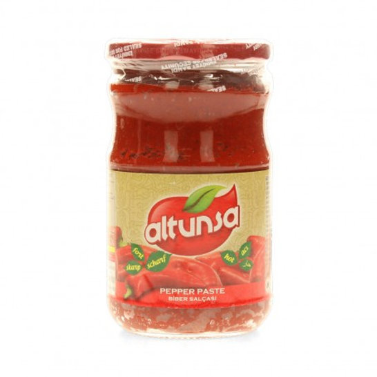 Altunsa Pepper Paste Hot 12 x 500g mirrors the sweet version but spicy (açı biber salçası), fiery chili concentrate for authentic Turkish/Mediterranean cooking, high capsaicin heat.