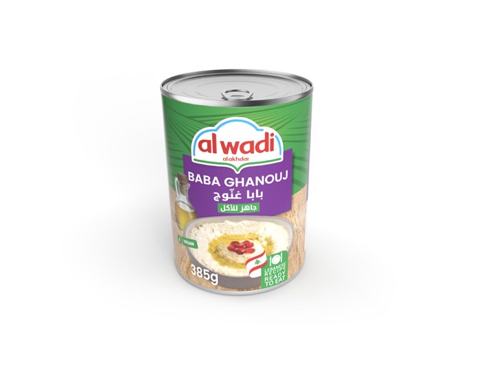 Alwadi Baba Ghanouj (Babaghanouj) 24 x 400g is a carton of 24 cans of smoky roasted eggplant dip from Al Wadi Al Akhdar, blended with tahini/lemon/garlic/salt (min 85% eggplant), smoky-creamy meze (132kcal/100g, 9.9g fat, 4.4g protein), serve with pita/veggies.