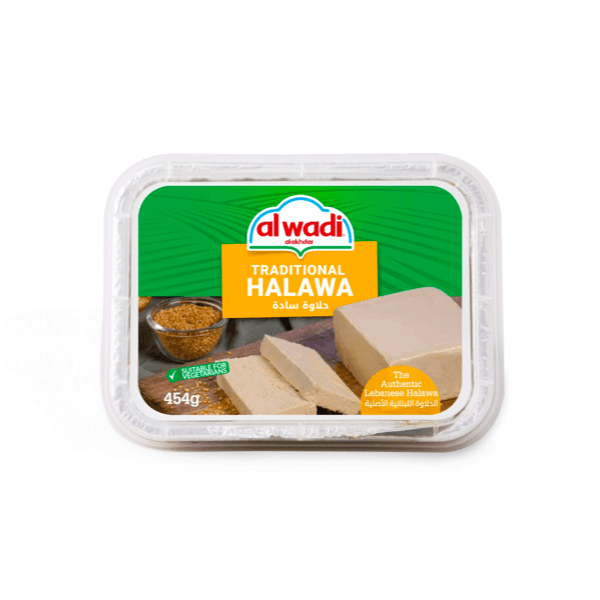 Alwadi Halawa 12 x 454g is 12 blocks of traditional sesame halawa (halva) from Al Wadi Al Akhdar (46% tahini, 34% sugar, 10% glucose), 542kcal/100g, 13g protein, 48g carbs, 32g fat; plain/pistachio/chocolate variants, sesame-allergy warning.