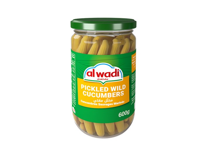 Alwadi Wild Cucumber 12 x 1kg features 12 jars of pickled wild cucumbers (mokti/ajour) in brine from Al Wadi Al Akhdar, sour/crunchy Levantine specialty (66% cucumbers/vinegar/salt/pepper/garlic), identical nutrition to regular, fiber-boosting gut health.