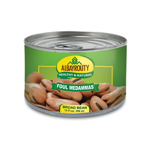 Bayrooti Broad Beans 400g (fava/foul) is a can of cooked broad beans from Al Bayrouty (Jordan), protein/fiber-rich (3g protein/5g fiber/19g carbs/100g, 90kcal) for salads, dips, stews, vegan staple.