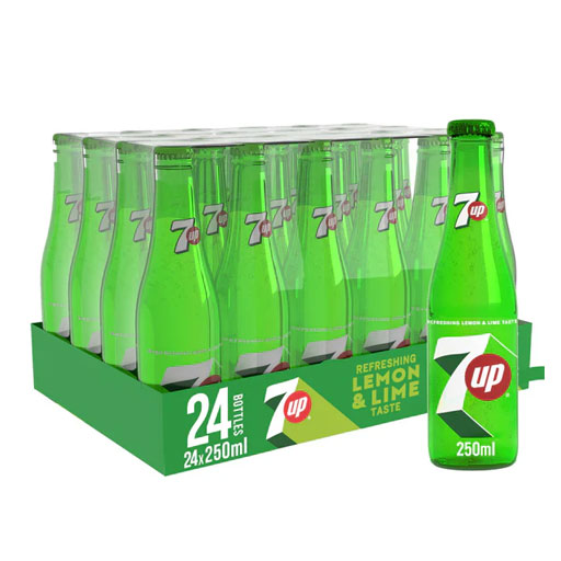 GLS 7UP bulk 24 x 250ml bottles bring crisp lemon-lime fizz to store shelves or events, blending carbonated water, sugar, citric acid, and natural citrus flavors for that zesty, uplifting refresh around 40-47 kcal/100ml with zero fat or caffeine. Retailers favor this 24-pack for quick stocking and high demand, perfect chilled straight for solo sips or mixed into punches keep in a cool spot and serve ice-cold to maximize the bubbly citrus spark.