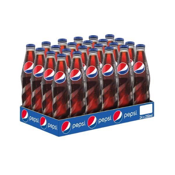 GLS Pepsi bulk 24 x 250ml bottles pack iconic cola fizz into returnable glass, blending carbonated water, sugar, caramel color, phosphoric acid, and natural cola flavors for that crisp, caramel-kissed refresh around 42 kcal/100ml ideal for meals or hangouts. Vendors and shops load up this 24-pack for reliable demand and retro charm, simply chill ice-cold, crack open for classic pours over ice, or straight to savor the timeless bold bite.