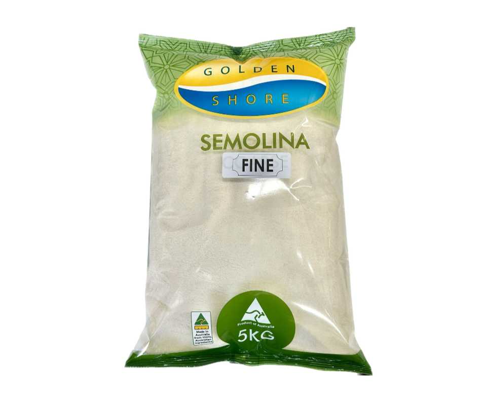 GS Semolina Fine G/S 5KG is a 5kg bag of finely milled durum wheat semolina from GS brand, ideal for pasta, couscous, puddings, cakes, and crispy coatings, high protein (11g/100g), low fat (1g), golden texture.