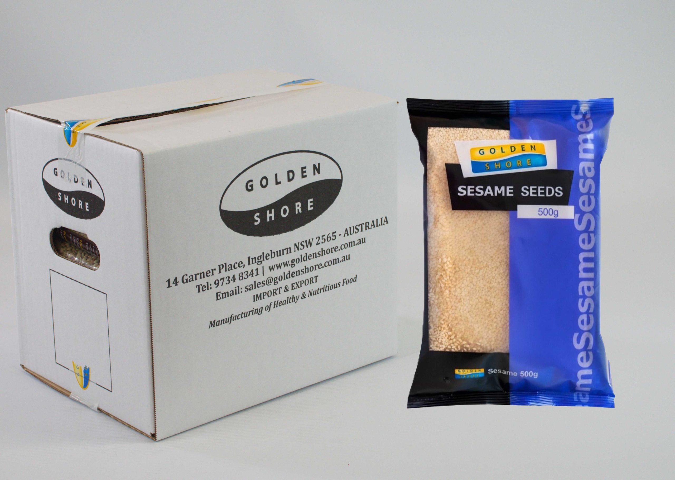 GS Sesame Seeds 500G x 20 is 20x500g hulled white sesame seeds from GS Exports/GS brand, hulled for nutty flavor/oil release, 2449kJ/100g, 55.6g fat, 17.7g protein, 17.6g carbs; calcium/iron-rich (975mg/14.55mg Ca/Fe). 10kg bulk for tahini, breads, salads; store cool/dry.