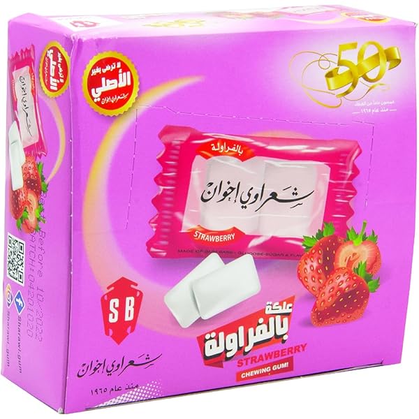 Sharawi Strawberry Gum 24 x 100 mirrors the mastic format: strawberry-flavored 2-piece dragees in 100-packet boxes x24 cartons, sweet-fruity chew from Jordanian maker. Long-lasting flavor; 4.8kg net total.