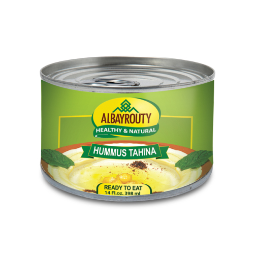 Humuse Tahina Bayroti 400g is ready-made hummus with tahini (chickpeas, sesame paste, lemon, garlic, salt) from Bayroti brand, creamy Levantine dip/spread, high protein (20g/100g tahini), vegan, 334kcal/100g.