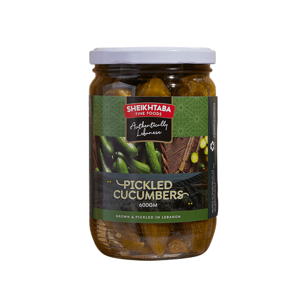 Sheikhtaba Cucumber 12 x 1kg features 12 jars of pickled cucumbers (gherkins) in brine/vinegar, crisp tangy meze for Lebanese tables, probiotic vegan condiment.